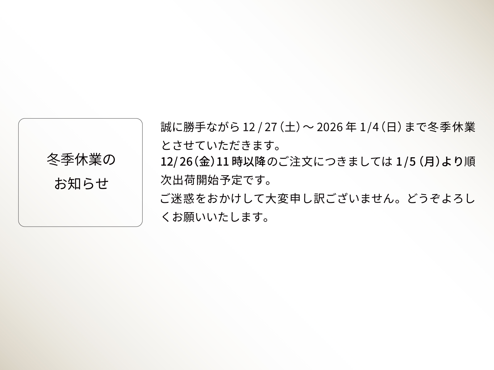 誠に勝手ながら、12月27日(土)~1月4日(日)まで、休業とさせていただきます。12月26日(金)11時以降にいただいたご注文及びお問合せについては1月5日(月)より順次ご対応いたします。ご不便をおかけしますが、何卒ご理解いただきますようお願い申し上げます。